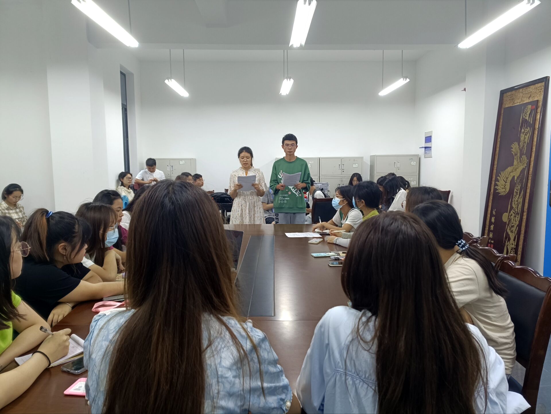 会议开始,第一党支部书记助理王叶子同志组织参会人员入座,随后开始活动排练。排练结束后,全体成员都对彩排中出现的问题和可以改进的地方提出了个人的解决方法,最后在王叶子同志的带领下整合了大家提出的解决方法,让活动更加完善。