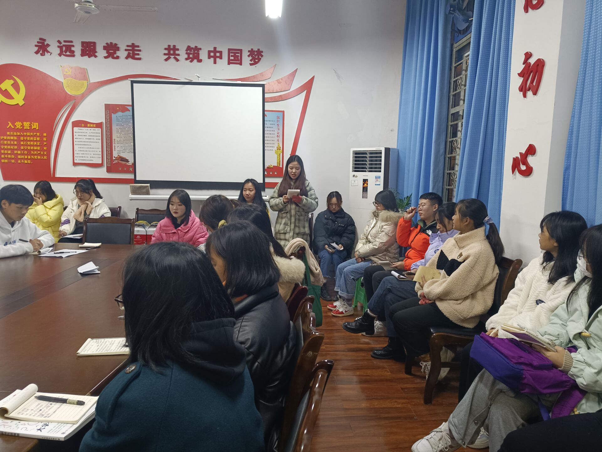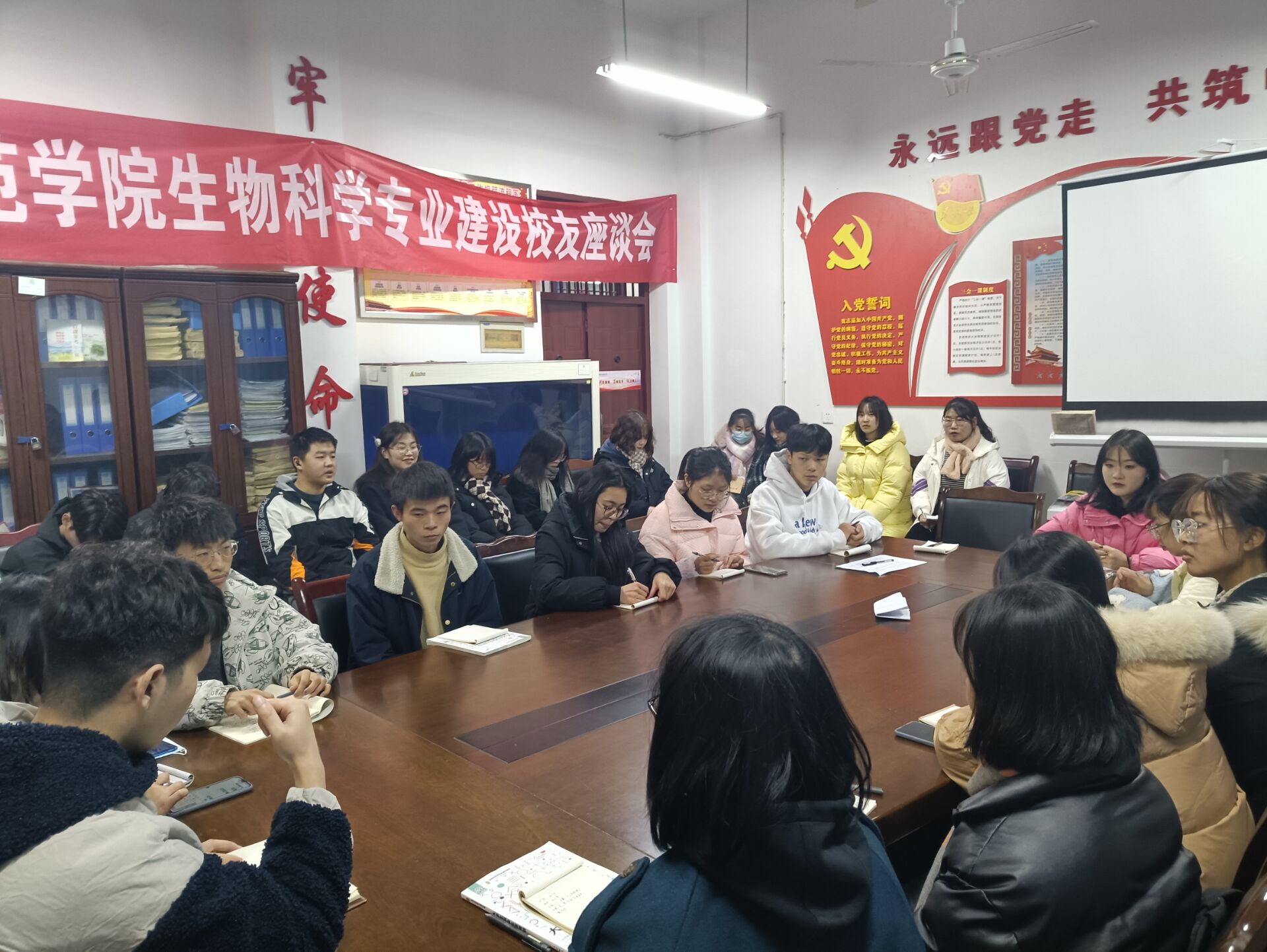 2021年12月27日晚上20时40分,公司员工党支部在第八教学楼104会议室召开工作总结会议,参加此次会议的有公司员工党支部第一党支部书记助理姜涛同志,第二党支部书记助理张芬同志以及员工党支部全体成员。