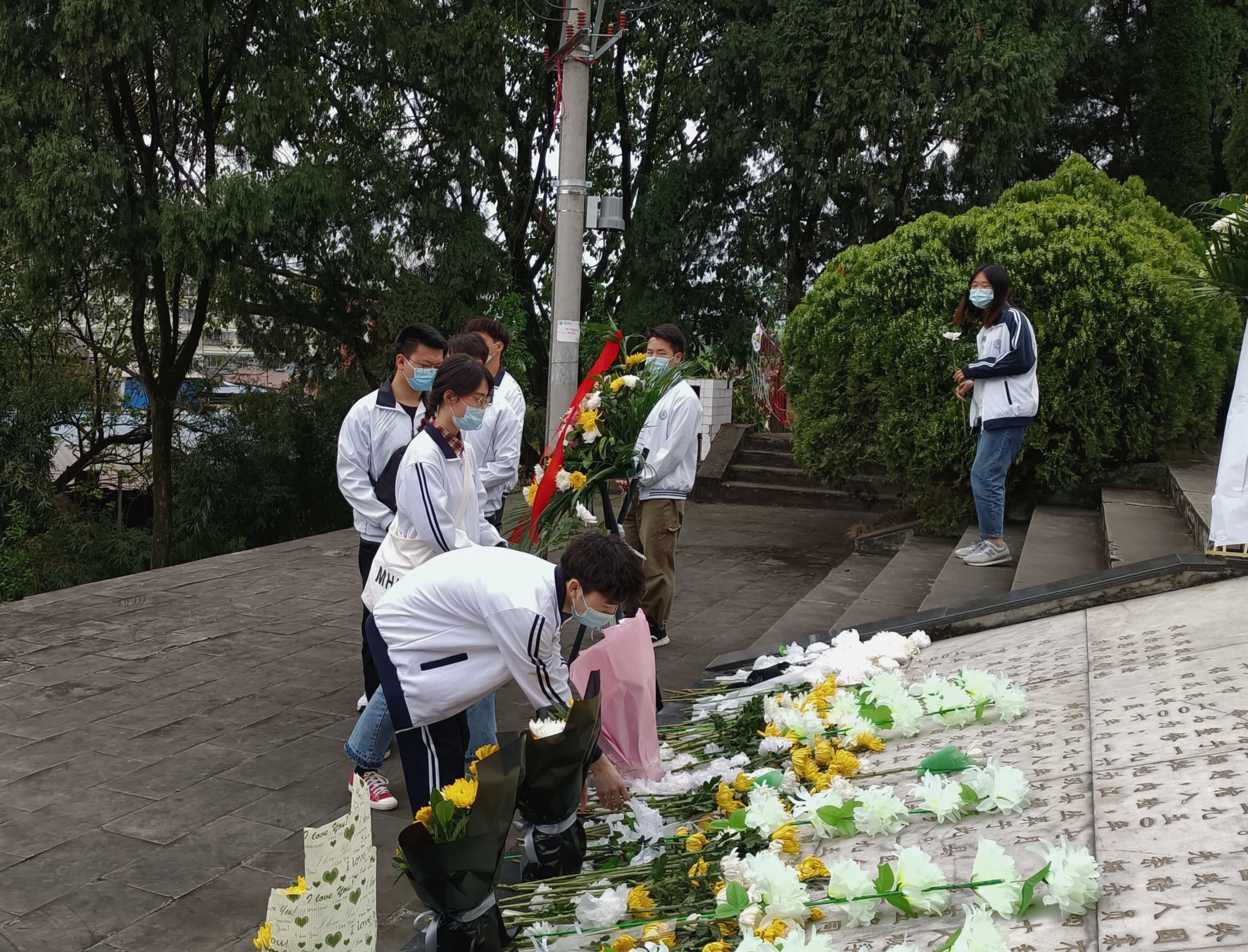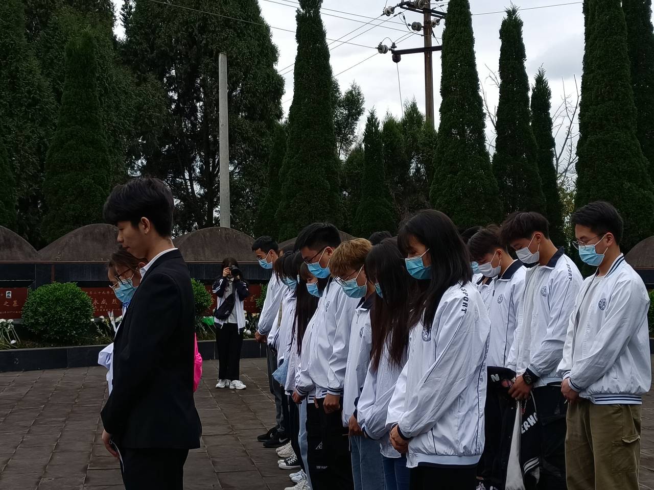 同志们到达陵园后统一列队,由主持人宣布活动正式开始,全体人员在烈士陵园碑前奏唱国歌。紧接着,由本次活动主持人姜涛同志带领同志们观看了陵园事迹栏,深入了解革命烈士的英雄事迹。然后,由党员代表作了精彩发言,并带领同志们进行宣誓。随后,辅导员杨雪娜老师和同志们各捧一束鲜花排队放置于烈士墓前,同时鞠躬三次并默哀三分钟。待同志们打扫完墓园和碑塔后,辅导员杨雪娜老师作了总结性发言。最后,全体同志奏唱国际歌,活动到此结束。