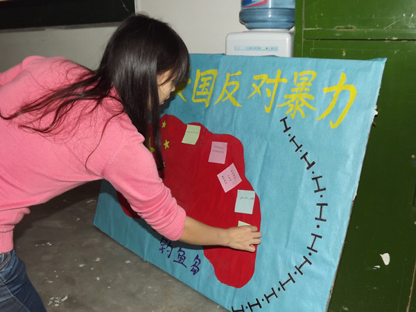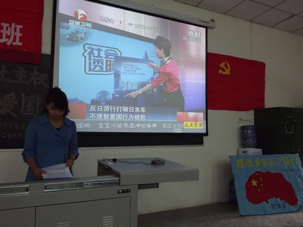 陈香同志也为大家播放了有关钓鱼岛的视频。她谈到:“要理性的爱国,努力丰富自己的知识,加强自身的专业涵养。利用我们的专业知识,使国家强大起来。”申绍祎同志就理性爱国这一观点也发表了自己的见解。她谈到:“游行只会使不法分子有机可乘,使爱国演变成内斗。我们不能把对日本人的恨发泄在同胞身上,为难同胞。要团结起来,抵制日货,从经济战上给日本人以沉重的一击。”李念峰同志也从军事、经济、旅游等几个方面给大家介绍了中国政府对日本购岛这一举动采取的措施。会议到此,很多在场的同志们都表达了自己对国家政府的信任。在主持人的带动下,他们把自己内心想说的话和想做的事都写在了便利贴上。表达了自己捍卫主权,理性爱国的决心。