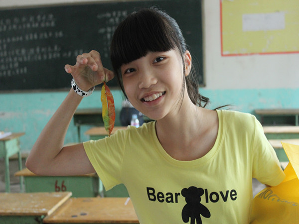 “同学们,刷的时候注意手的力度,顺着叶子上面的脉络往下刷,等正面绿色的叶肉刷干净后再翻到背面继续刷。刷干净后记得要用水清洗,然后放在一旁晾干。”志愿者曹敏站在讲台上举着一片刷净叶肉的树叶说。