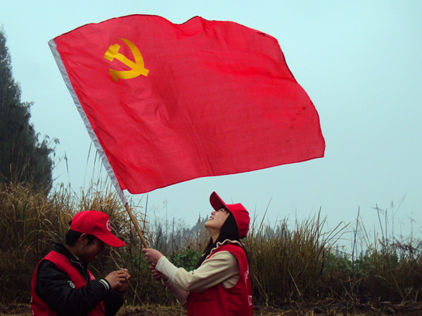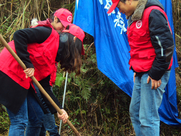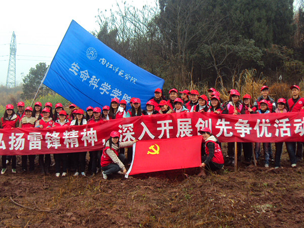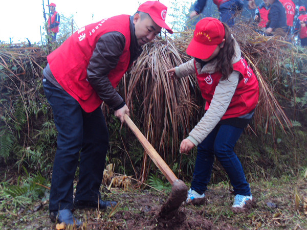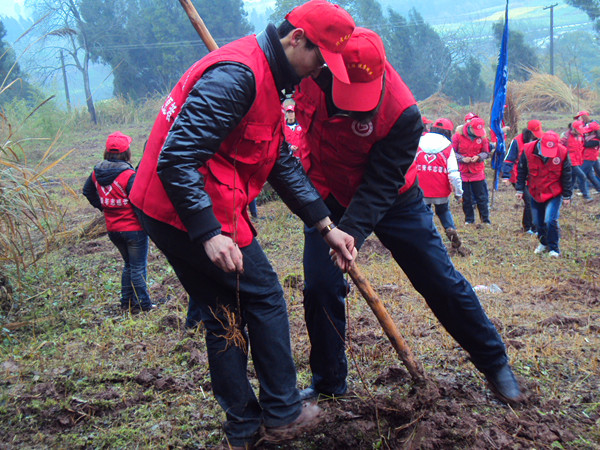 全体人员穿上志愿服,自带水桶于早上8:00在西区图书馆门口集合并乘车到达植树地点——内江市东兴区高桥镇凤庙村。大家于8:30分到达凤庙村,在凤庙村的村官们分配好农具并讲解完植树技巧后,党员同志们纷纷起拿起工具开始植树,在党员的带动下,同学积极地参与到此次植树活动中。植树活动开始热火朝天地进行。