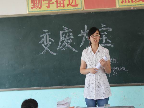 活动开始,三个班级的员工聚集到初二的教室,黑压压的座位上孩子们的脸被蒸成了红苹果,一撮撮头发下汗水在颗颗往下滴。主持人章薇一上场就说到:“我看大家今天的热情是很高涨啊,我觉得这似蒸笼的教室有大作用,希望同学们在‘变废为宝’的比赛中都有好的成绩。”原本有些压抑的教室里立马有了生机,员工们笑得前俯后仰,一阵阵笑声穿过门窗飞出教室,引得树上的蝉叫个不停。