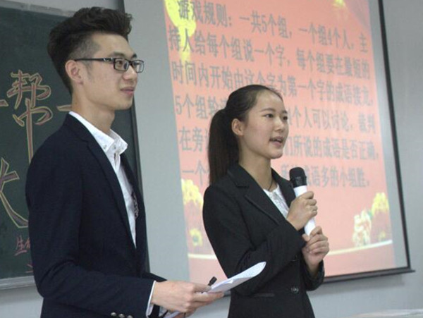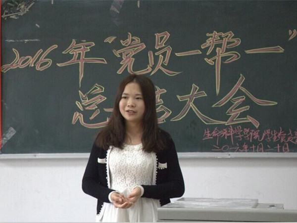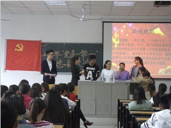 大会伊始,首先由主持人彭珮媛同志和陈梓豪同志为我们致以开场词并简要介绍了开展此次会议的主要目的。之后由党员“一帮一”代表2014级3班的唐瑞同志上台讲述了他的帮扶经历,在帮扶过程中,他积极帮助新生熟悉环境、熟悉生活、熟悉党支部,将党支部的温暖传递给了每一位新生。他表示这次活动不仅段炼了他自己,拉近了与师弟师妹的关系,同时更收获了满满的感动,希望这样的温暖可以一届一届的传递下去,让我们生科院成为一个温暖而又优秀的大家庭。之后为了活跃会场氛围,中途插入了一个小游戏—成语接龙,游戏过程中新生们与师兄师姐们配合得十分默契,你刚说罢我接场,热闹非凡,无一不展现同志们的优秀与活力。精彩的游戏过后便由2016级新生贺鑫英和李欣同志为我们带来诗朗诵《青春赞歌》,婉转的音乐声伴随着党员“一帮一”的回忆,感动了在场的所有同志,优美的朗诵声飘荡在每个人心头,字字铿锵,发人深省。美妙的诗朗诵之后会议也接近了尾声。