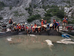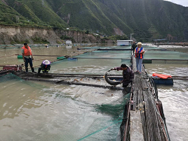 实习同学在甘肃基地网箱上协助抢救鲟鱼
