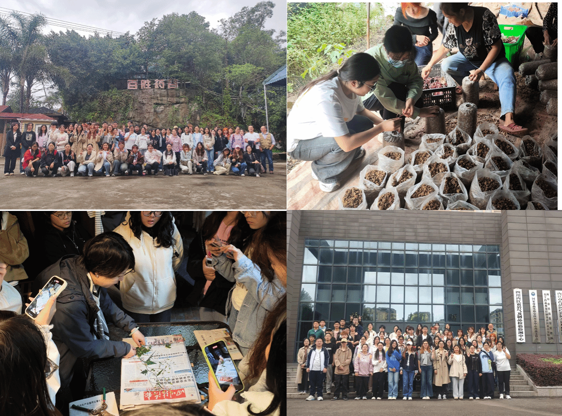 见习分为两个板块:(1)近郊见习中,通过在威远百胜药业、内江市食药质检中心、恒通动保、天赐村柑橘基地、食用菌基地等多家单位的参观学习,同学们切实了解了生物药企的制药流程及原料分离纯化、有效成分检测、食用菌种植等工艺和技术。(2)远郊实习中,在成都荷花池中药材专业市场、青城山等地,同学们了解了常见野外药用植物的类别、药用价值及利用方法等。学习并掌握了对药用植物的鉴别、采集、处理、储存,以及植物标本的处理与制作等基本方法。