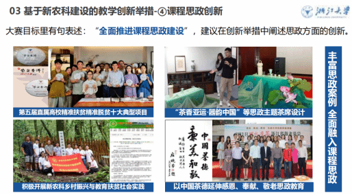本次培训围绕“六大赛道的课堂实录、教学创新成果报告、教学设计创新报告、课程思政创新报告”等环节,进行细致透彻的讲解。此外,还邀请了第四届全国高校教学创新大赛六大赛道6位一等奖获奖名师分享参赛经验,从理念创新、内容创新、方法创新、评价创新、申报材料准备及撰写、参赛准备等方面进行详细指导。第四届全国高校教师教学创新大赛新农科副高组一等奖,浙江大学茶叶研究所特聘副研究员周继红,以参赛课程《茶文化与茶健康》为例,从新农科人才培养与教学创新思考、以员工为中心的教学设计与实施、教学创新报告的构思与撰写等方面进行了分享。基础课程赛道海南大学于赫副教授、课程思政赛道北京理工大学赵振峰教授、新工科赛道西安建筑科技大学史琛教授、新文科赛道中国石油大学(北京)吕慧副教授和新医科赛道哈尔滨医科大学孙若晗副教授也详细分享了各赛道备赛参赛经验及其建议。
