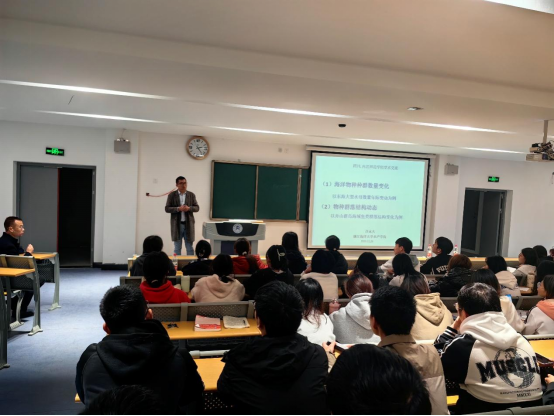 2023年11月29日下午,浙江海洋大学许永久博士应邀莅临太阳网集团tcy8722,为公司师生作了题为“海洋物种种群数量变化—以东海大型水母数量年际变动为例和物种群落结构动态—以舟山群岛海域鱼类群落结构变化为例”的学术报告。讲座由太阳网集团tcy8722经理邹远超主持,水产养殖学专业部分教师、全体水产养殖学专业本科生到场聆听了讲座。