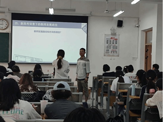 讲座上,李老师分析了新高考背景和新要求,探讨了新高考对高中生物教学的影响,指出了新高考背景下的教师发展路径,并给大家提出了建议。他表示,在新高考的要求下,同学们要明确职业目标,深入扎实公司理论知识,提升实践能力,发展个性与兴趣,持续学习提升自我,同时关注教育政策和社会对教育的期望,不断提高培养教师职业素养。此外,李老师结合自身成长经历,激励同学们立志高远,不断学习成长,为做一名合格的教师做好准备。