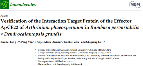 2023年3月25日,公司青年教师方馨玫博士以第一作者身份在《Biomolecules》上发表题目为“Verification of the Interaction Target Protein of the Effector ApCE22 of Arthrinium phaeospermum in Bambusa pervariabilis × Dendrocalamopsis grandis”的科技论文。该期刊属于生物学二区期刊,影响因子为6.064。