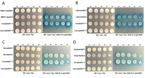 前期研究已经证明效应子ApCE22在病原自身的毒力中具有重要作用,该团队继续深入利用酵母双杂交技术以ApCE22为诱饵蛋白从寄主杂交竹中筛选到27个与之互作的蛋白,接着借助双分子荧光互补实验和Pull down沉淀实验进一步验证后,得到DnaJ和B2蛋白质分别与毒力效应子ApCE22具有相互作用,这些互作蛋白被发现在植物抗性中具有积极作用。这一研究为后续寄主杂交竹中抗病基因及抗性代谢通路的研究奠定基础。