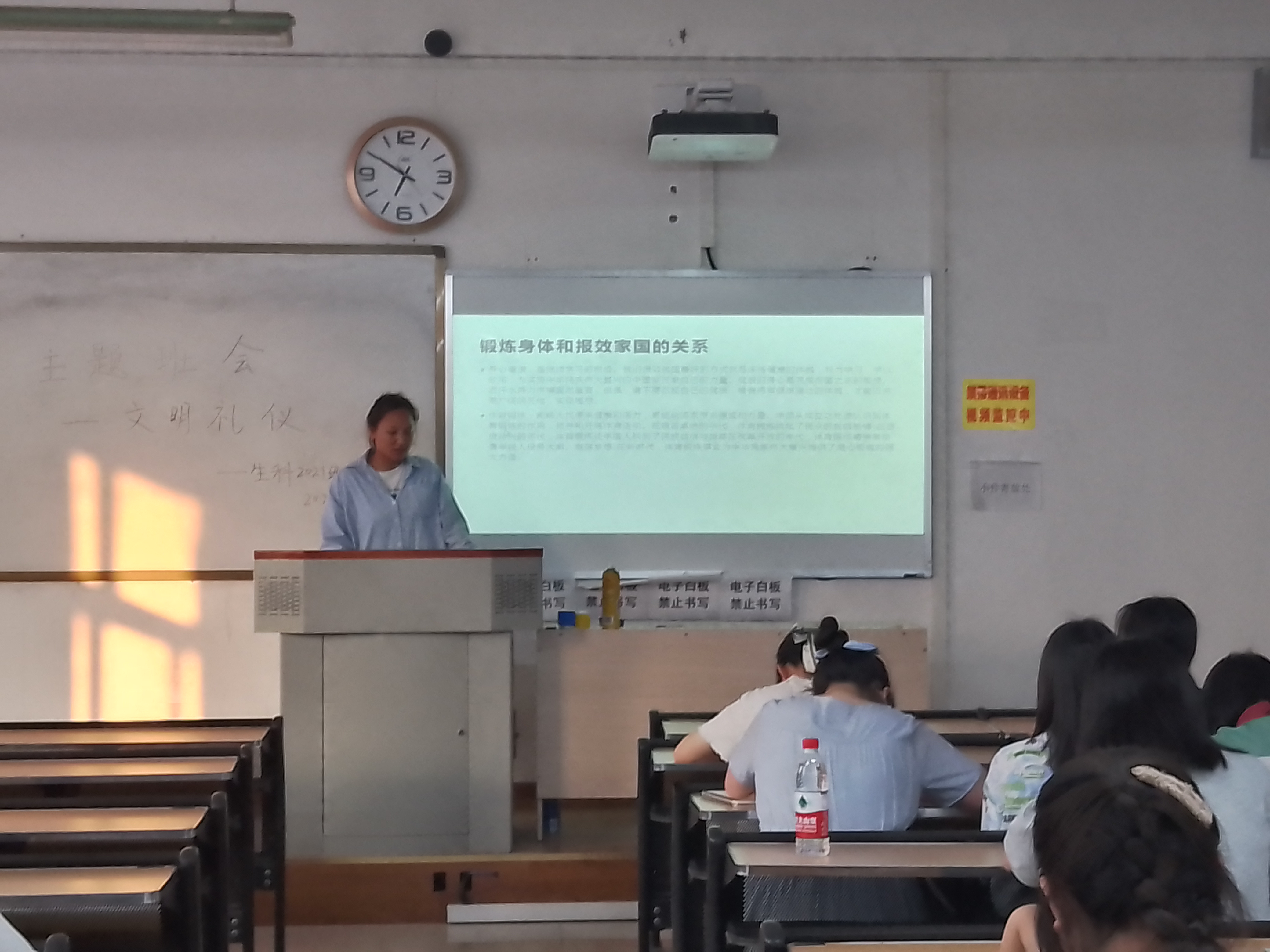 为了让同学们拥有一个健康的身体学习与生活,报效国家。公司2021级1班于在五教北703于5月9日18:00开展了以“健强体魄,报效家国”为主题的班会。此次班会由体育委员苏婧主持,2021级1班全体成员参加。