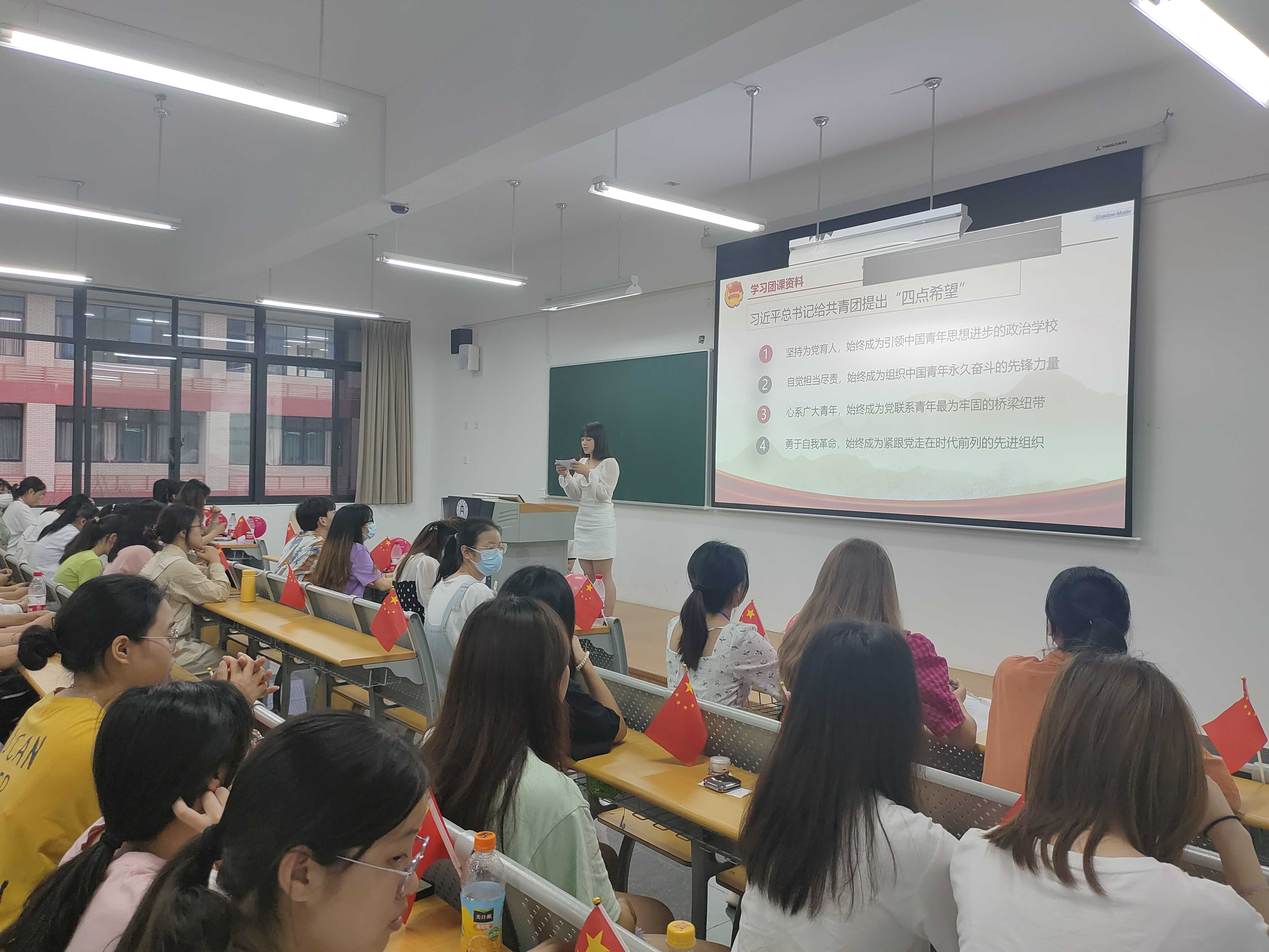 迈进新时代,要树立远大理想,心怀坚定信念,更要脚踏实地奋斗,砥砺奋进初心,为祖国建设贡献青春力量。2021级2班全体同学一起学习观看了建团百年纪录片《希望》,通过观看此视频,同学们更加体会到“青年兴则国家兴,青年强则国家强”,青年一代有理想、有本领、有担当,国家就有前途,民族就有希望;2021级1班主持人与大家共同学习共青团百年征程的“四条宝贵经验”以及习近平总书记对共青团提出的“四点希望”,争做新时代共青团员的“五个模范”,激励同学们做一个斗志昂扬、团结奋进的青年人,不辜国家期望,不负人民厚望;2021级3班组织同学排练了共青团《一起向未来》手势舞,伴着歌声,动作到位,气势铿锵,用双手演绎出无限的热爱和崇高的信仰。背后草木葱茏,天空明澈;四周团歌激荡,热情如火;心中信仰坚定,前路光明!