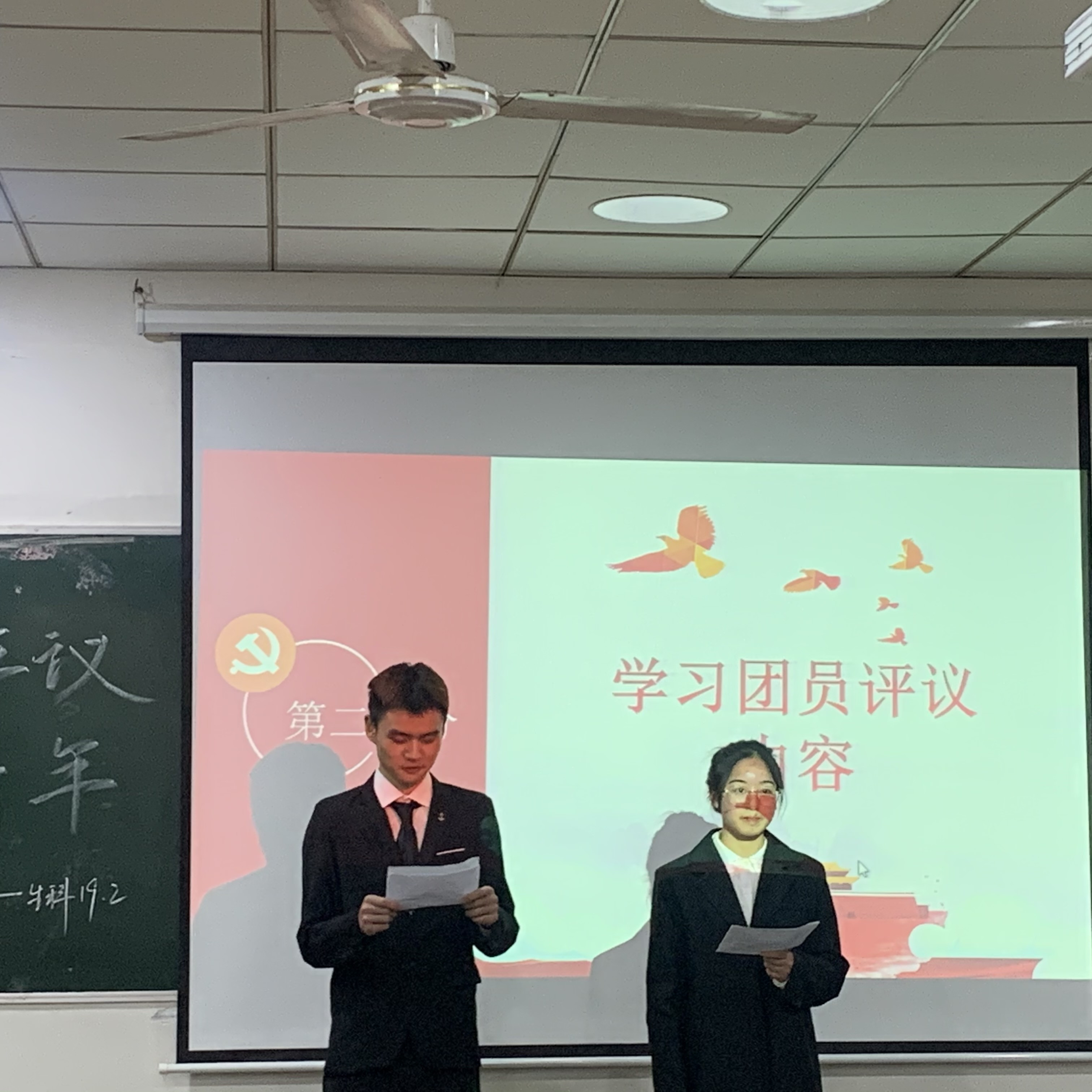此次班会由王显桢同学和罗雪同学担任主持人,本次的活动流程:第一步是主持人致开场词,宣布本次以“做好团员评议 争当有为青年”为主题的团组织生活会正式开始。第二步由主持人主持全体起立,奏唱团歌《光荣啊,中国共青团》。第三步由岳雅冰同学带领大家学习团员评议内容和要求。通过有效地学习,使广大团员明确新时期共青团的任务以及合格团员的必备素质,激励同学们做一个昂扬斗志、坚定信念、团结奋进的青年人。第四步设置团员评议相关内容题目。由主持人出题,同学抢答。使同学们明确学习内容,加强团员思想建设、规范团内纪律。第五步集体观看视频《我是共青团员》。学习优秀团员标准,让同学们以此标准严格要求自己,不断提升自我、完善自我。第六步由黄凯、邹颖两位同学带来朗诵《团结在共青团的旗帜下》。使同学们深刻理解共青团的发展,激发争做有为青年的斗志。第七步由李坤洋等同学带来合唱《明天会更好》表达对中国共青团的崇高敬意,使同学们对未来建设祖国充满希望。第八步由主持人带领大家重温入团誓词。使同学们再次明确自己的共青团员身份,同时明确自己的义务和职责,增强责任感和使命感。最后主持人宣布本次团组织生活会圆满结束。