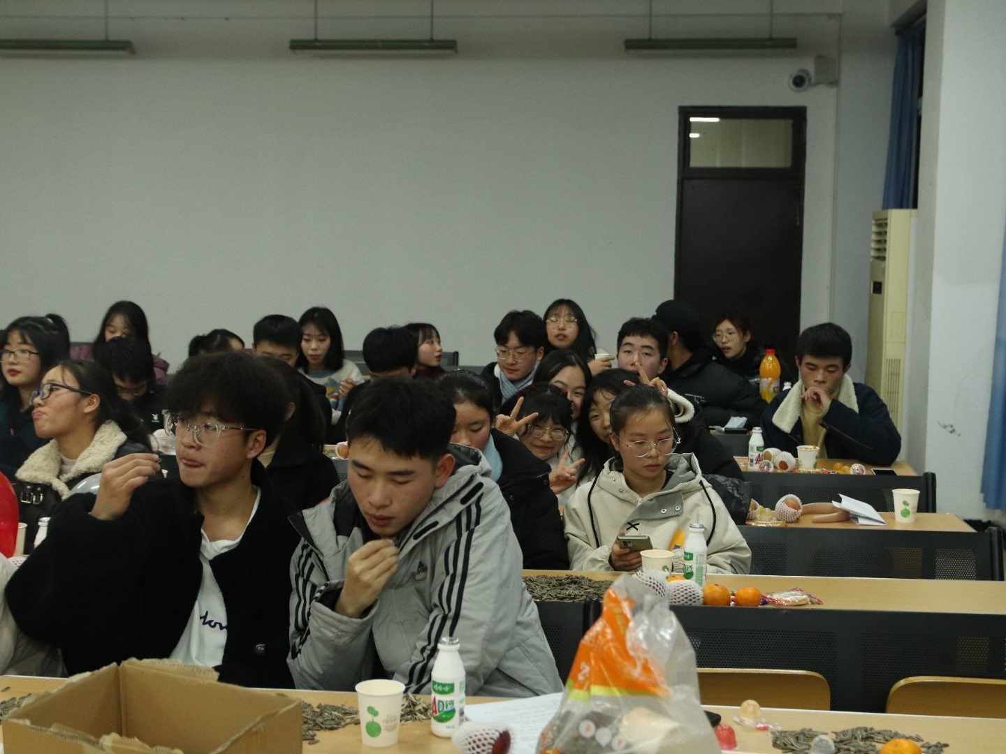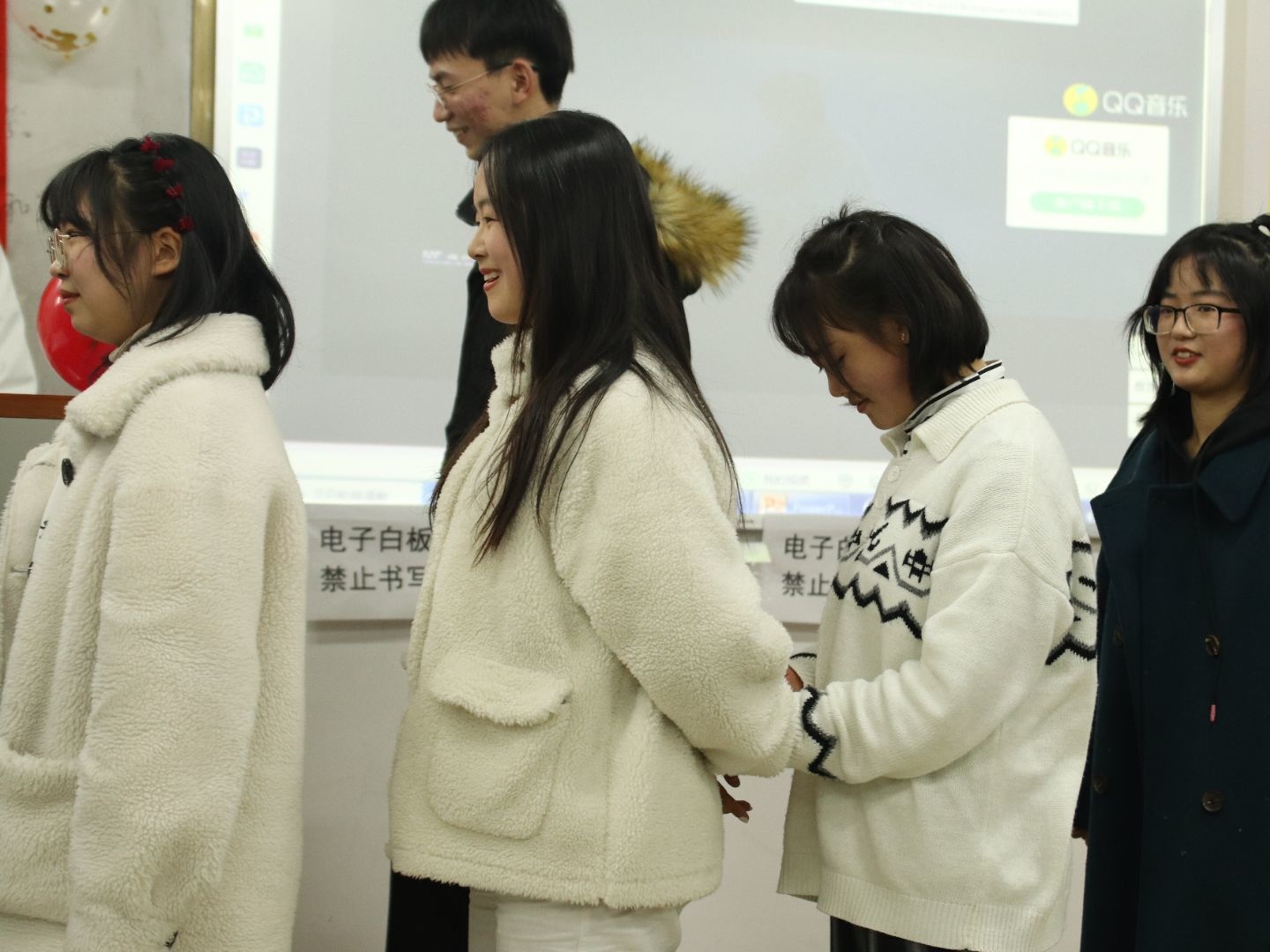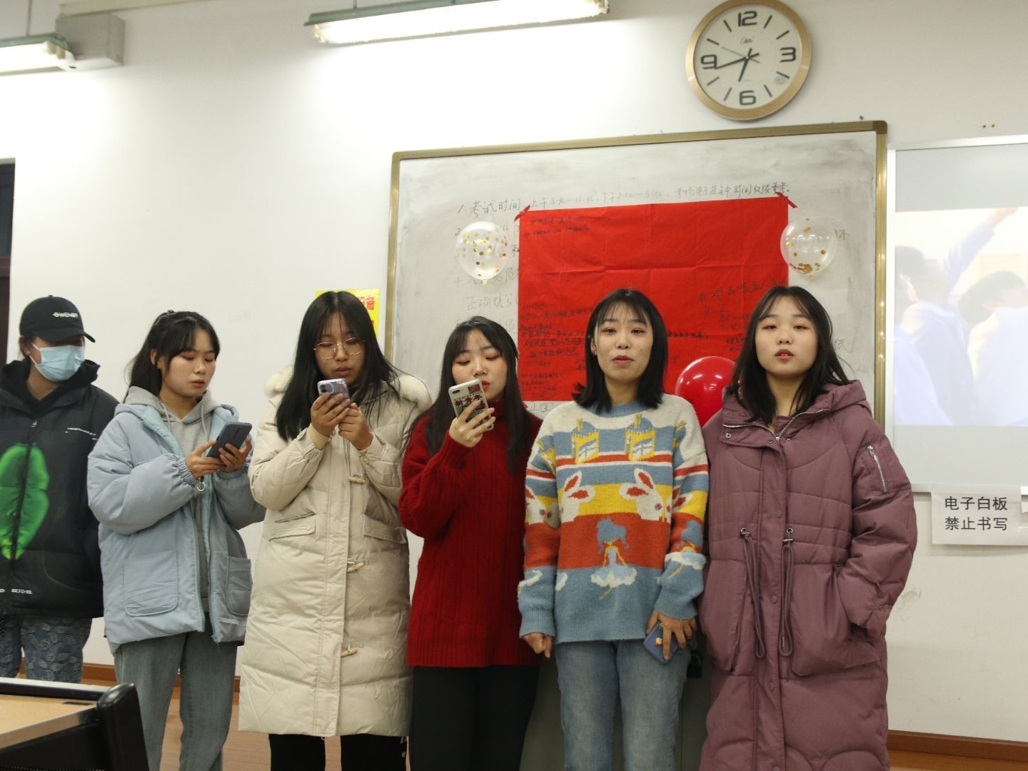 活动开始之前,班委及班上同学积极装点教室,欢快的氛围蔓延开来,主持人胡喜娜让同学们将自己的新年愿望写在纸上,同学们带着对来年的期待,对今年的总结,写下了心中最美好的愿望。活动的开始,是316的节目《醉》,精心的视频制作,美妙的歌声感染着我们,一曲毕,是“猜灯谜”活动,在气球中放上纸条,任意选中气球,回答上面的问题或完成上面的活动,氛围轻松,大家都积极参与。315的《寢室后宫甄嬛传》让人爆笑不断,惊喜连连,接下来的游戏是传话游戏,淘汰赛制,紧张而又搞笑的氛围让我们很开心。318的《修炼爱情》和320的《时间煮雨》,耳熟能详的歌声让同学们不自觉跟唱,在闪光灯中,大学沉浸其中。男生421的《精忠报国》,激情飞扬,歌声飞扬。活动形式多样,让同学度过了愉快的一晚上。