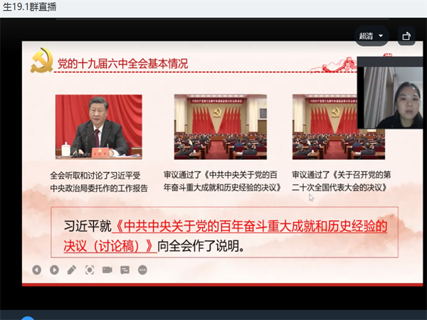 会议开始,班长李智先为同学们讲解了关于员工综合素质测评的实施办法,主要分为德育测、学业测评以及体美劳与发展性测评三个部分。随后,班长提醒同学们要注意防控疫情,出校门一定要向班主任请假。班长还强调,室长一定要每天分三次测量室友的体温,并且将体温记录在体温表中。如果有同学没有打新冠疫苗加强针,一定要尽快去打,打了以后把证明截图交给班长。随后,班长还从吸毒,防火,校园防盗,网络安全等五个方面为同学们讲解需要注意的事项。如,寝室内不要牵拉电线,不使用违规电器。不要在网络上发表不当言论,不要逛不良网站,不要相信刷单可以赚钱。班主任曹老师提醒同学们对于疫情防控不能有侥幸心理,随意对待,偷偷出校。然后,曹老师为同学们讲解了十九届六中全会。曹老师将这次会议分为三个部分向同学们讲解,第一部分,党的十九届六中全会基本情况,全会听取和讨论了习近平受中央政治局委托作的工作报告,审议通过了《中共中央关于党的百年奋斗重大成就和历史经验的决议》,审议通过了《关于召开党的第二十次全国代表大会的决议》。第二部分,《决议》产生背景与重大意义。第三部分,《决议》的基本框架和主要内容。