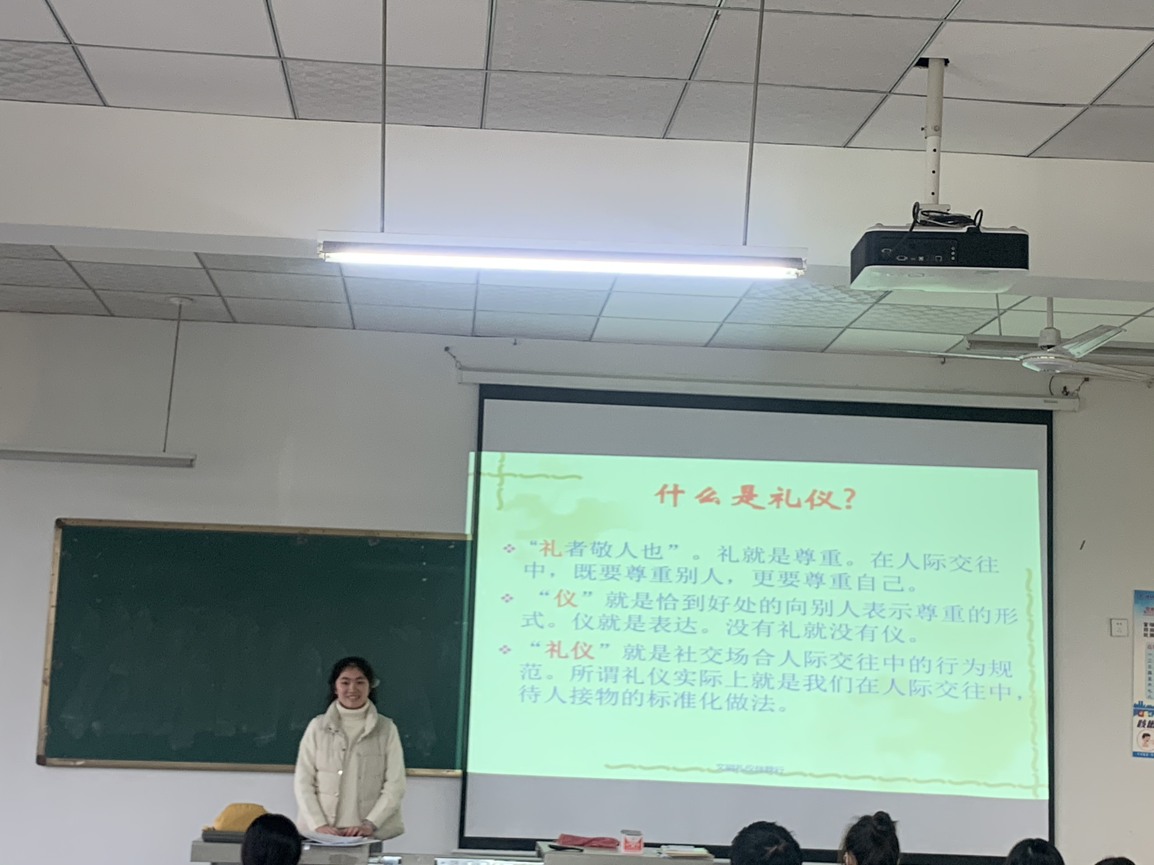 此次班会由张霞同学为大家讲解,首先是什么是礼仪?“礼者敬人也”。礼就是尊重。在人际交往中,既要尊重别人,更要尊重自己。“仪” 就是恰到好处的向别人表示尊重的形式。仪就是表达。没有礼就没有仪。“礼仪”就是社交场合人际交往中的行为规范。所谓礼仪实际,就是我们在人际交往中,待人接物的标准化做法。然后是讲礼仪的意义,有三个方面:1、内强素质,2、外塑形象,3、增进交往。第三部分是礼仪的原则是什么?敬人原则。尊敬他人, 是人际交往获得成功的重要保证,也是礼仪的核心。敬人的原则,就是要求在运用礼仪时,务必将对交往对象的恭敬与重视放在首位,切勿伤害对方的自尊心。二、自律原则。 自律,就是要克己,慎重;就是要在运用礼仪时,积极主动,自觉自愿,表里如一,自我对照,自我反省,自我要求,自我检点,自我约束。不允许妄自菲薄,自轻自贱;也不能人前人后不一样,生人熟人面前不相同。三、适度原则。运用礼仪,与做其他事情一样,讲究具体问题具体分析,而且应当牢记过犹不及。所谓适度,就是要求在运用礼仪时,既要掌握普遍规律,又要针对具体情况,认真得体,掌握分寸,不能做得过了头,也不能做得不到位。四、真诚原则。应用礼仪,必须诚心诚意,待人以诚。这样去做,待人友好与敬意才易于为他人所接受。不允许在运用礼仪时逢场作戏,言行不一,口是心非,投机取巧,做假骗人。