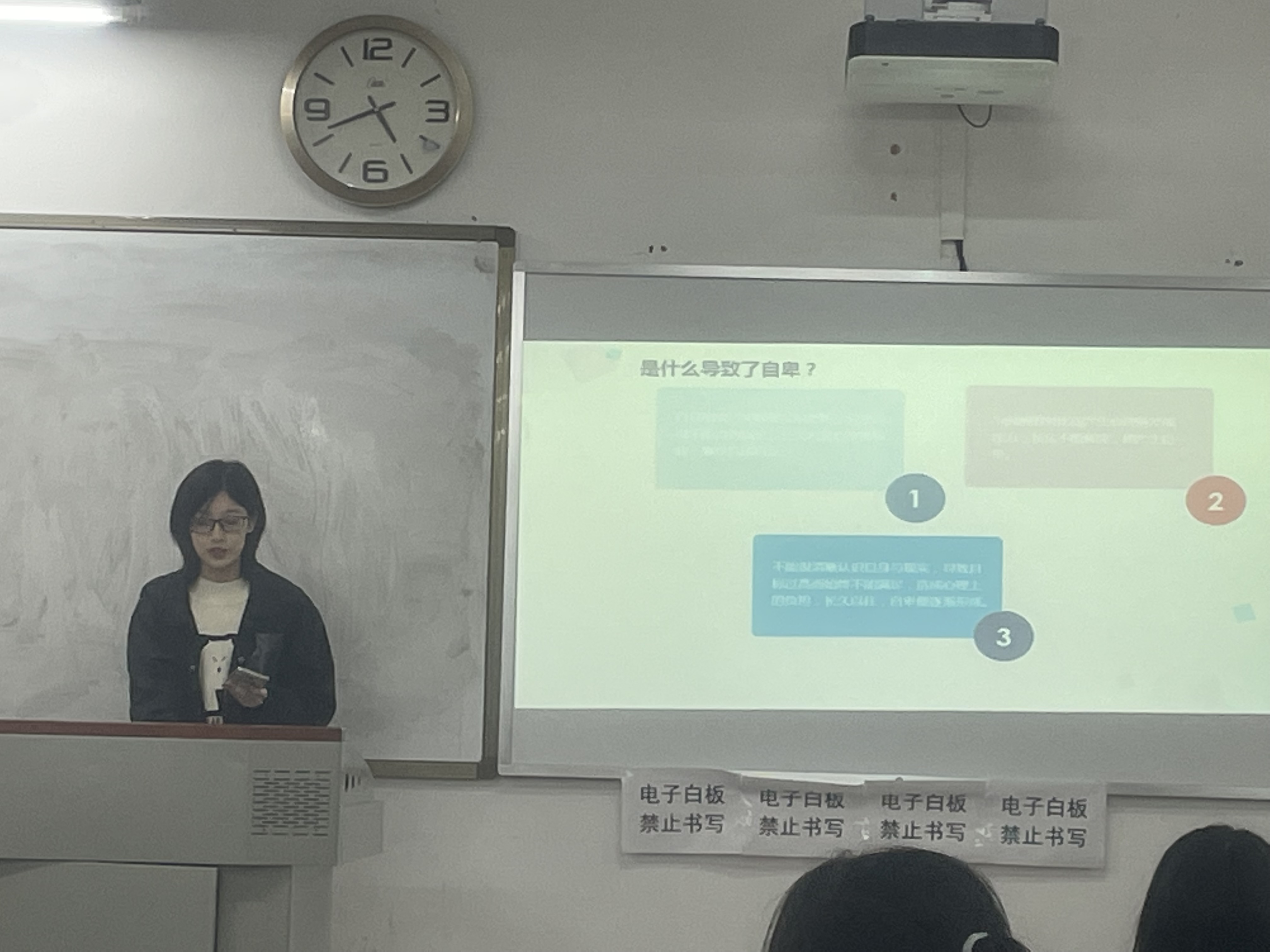 班会正式开始,首先是心理委员进行了基本的心理方面的知识科普,接下来进行第一个有奖竞猜的游戏:共选有三组同学,一组二人,甲背对PPT,乙面向PPT,乙根据PPT的内容进行描述,但描述中不能出现该内容的字,否则该题无效换下一题,甲根据乙的描述猜出PPT上的内容,答对进入下一一题,答错可继续也可选择放弃,进入下一题。时间为3分钟,比较三组的最终答对个数,获胜者有奖励。