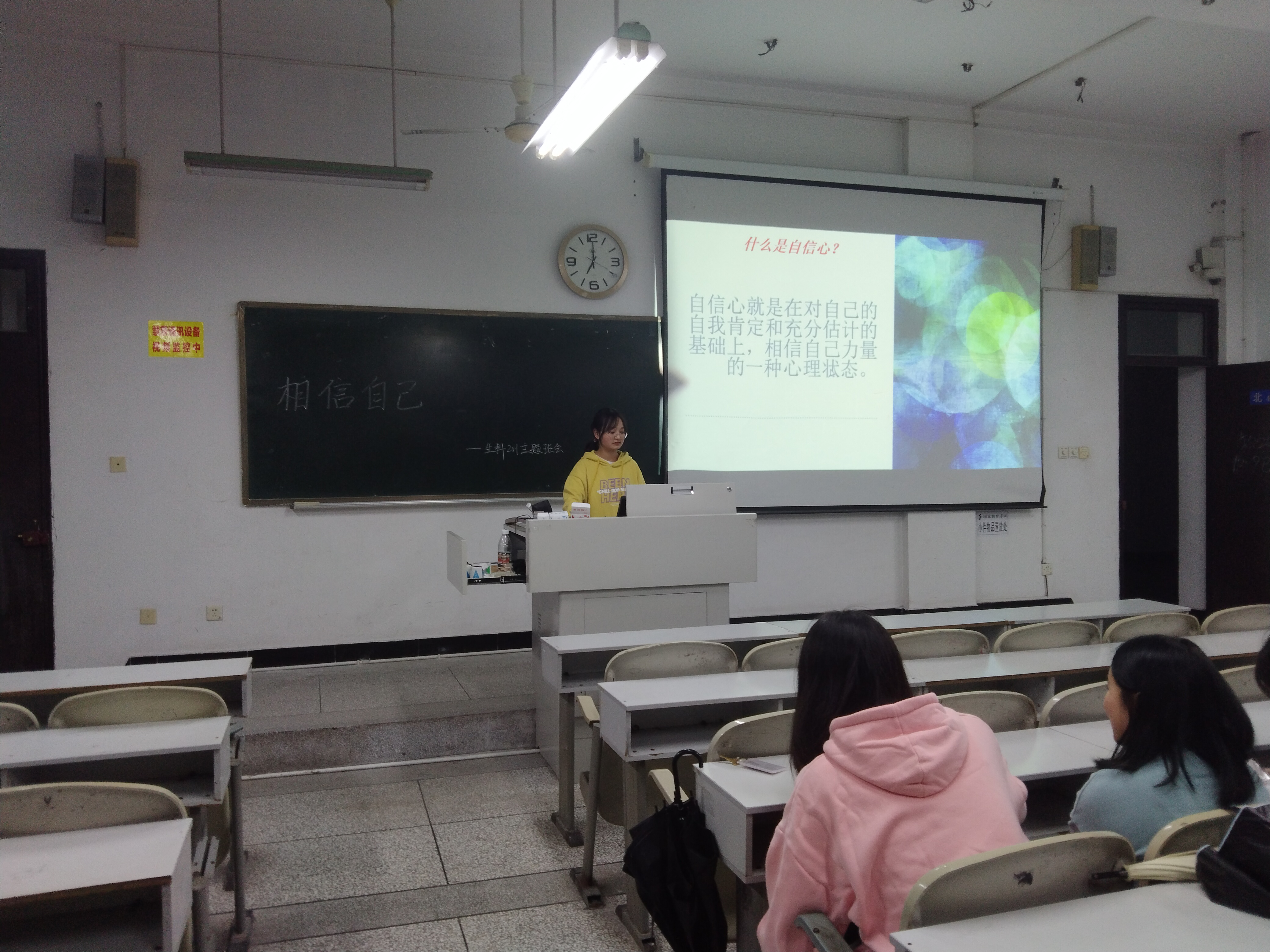 班会开始,通过安敏同学对自大、自信、自卑的特点以及如何建立自信和认识自己的优点、能力和特长详细讲解。并且通过如何加强自己的学习能力、交际能力、体育特长、动手能力的方法来帮助同学们建立自信。告诉同学们在日常生活中要多尝试成功的体验,多做自己最拿手,容易取得成功的事情和把目标分为若干阶段的小目标。以此来充实自我,提高自身能力,建立自信。然后通过提问什么是自信心、如何建立自信,让同学们在对自己的自我肯定和充分估计的基础上,相信自己力量的一种心理状态,也让同学们有更深刻的认识。最后,董磊同学组织员工们观看了励志短片《阳光自信》的宣传片,通过电影中一些场景感染员工,并通过写观后感提升自我认同感,此外,我们网络搜索几则故事有关失败者成功的故事来激励员工。