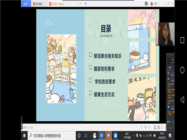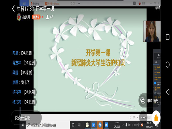 为深入学习疫情防控知识,响应国家防控工作要求,保持疫情防控常态化。我班于2020年9月2日星期三下午19:30在网络办公软件钉钉开展了以“新冠肺炎老员工防护知识”为主题的开学第一课,此次班会,由敬晓琴担任主讲人,班主任王均老师以及生科17.3全体同学共同参加。