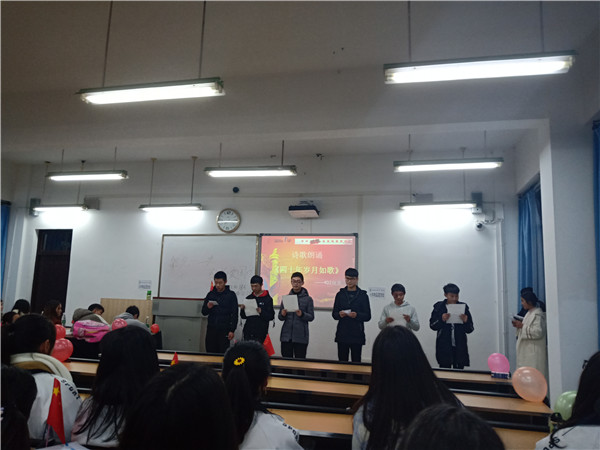 活动首先由汪峰同学为大家介绍了“一二九”活动的由来及意义,“一二九”活动是北平员工的爱国行动,此次活动得到了全国员工的回应和全国人民的支持,推动了抗日民族统一战线的建立。它标志着中国人民抗日民族运动新高潮的到来,它是准备思想和干部的运动,是动员全民族的运动,有着重大的历史意义。接着由两位主持人带领大家举行了知识竞赛,帮助大家回顾了一些关于“一二九”的基本知识。然后是由黄代淞同学带来的武术表演,精彩的武术表演彰显了中华男儿的血气方刚。接着是由女生133寝室带来的手语操《国家》,整齐的动作赢得了同学们的大片掌声。然后是由男生403寝室带来的诗朗诵《四十年岁月如歌》。激昂的话语彰显了大家的昂扬斗志。最后由班主任邹远超老师带领全体同学观看了爱国视频并做了活动总结。