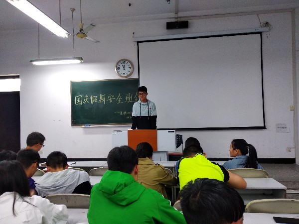 2018年9月29日,我班于上午十一点在五教北104教室积极开展了“国庆假期安全”的主题班会。本次会议由班长潘峰主持召开,班主任王均老师及全体班级同学参与。