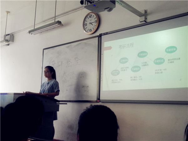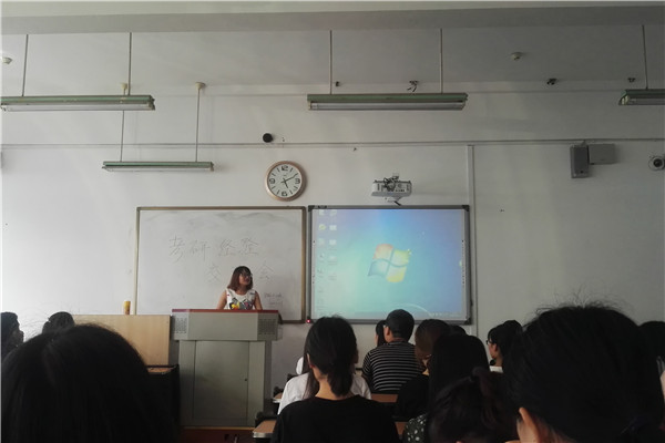 首先,由我班主持人,毛跃同学详细的介绍了这次交流会的主要目的,以及代表全班同学欢迎师姐们的到来!之后,我们迎来了第一位师姐为我们介绍她的考研之路。听到她的介绍我们不由的投去羡慕、崇拜的目光,她是如此的优秀!再之后,几位师姐陆续的上台为我们分享!而在座的每一位都聚精会神的关注着她们。通过她们的学习之路来反思我们的错误,不少的同学发出这样的感慨:"别人在努力的走着,我们在痛快的玩着!"。