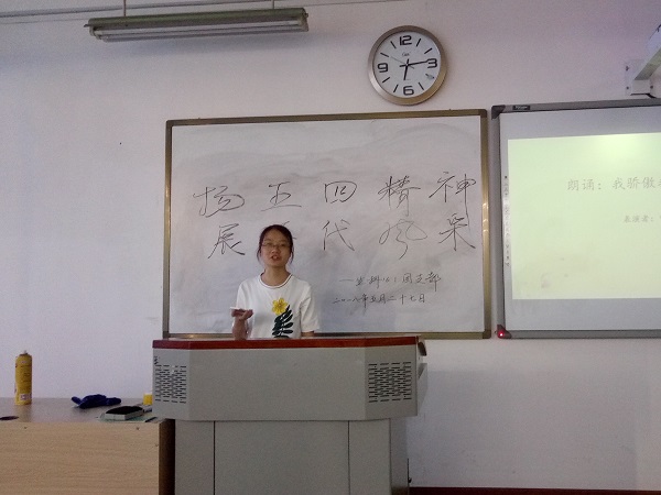 其次,发扬“五四”精神,就是要不断地加强学习。要充分利用好今天的大好时光和优越条件,学科学,学技术,学理论,掌握本领,端正思想,规范行为,提高觉悟,为祖国的振兴和繁荣出力加油。为了更能形象具体地说明“五四精神”,张涵雪同学和肖鑫慧同学结合自己实际生活体验发表了自己对于“五四精神”的看法。讲话贴近生活,声音来自心灵,震撼着在座的各位同学!