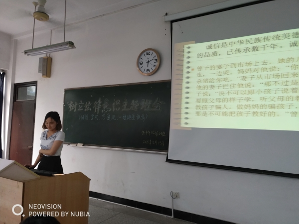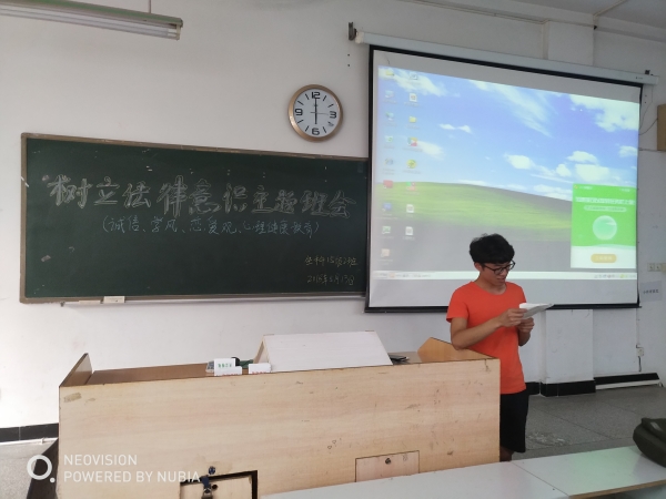 2018年5月13日晚6点,本班于第五教学楼北楼401教室召开了以《树立法律意识》为题的主题班会,本次主题班会由韩秀梅同学主持,15级2班全体同学参加,由班主任李武老师进行指导。