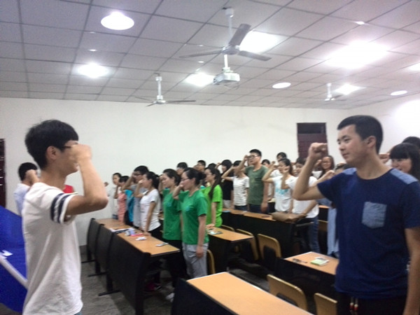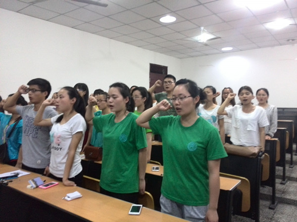 经会议决定成立了宣传小组和组织小组,两小组间具有明确的分工。队伍成员还提出了一些实际可行的建议,例如:建立通讯录、服务时间不得少于多少小时等。都为的是把此队伍建设好,让它成为生科特色之一。最后,在覃仕洪的带领下,全体成员纷纷举起右手进行宣誓。他们铿锵有力的说着:“我宣誓,我愿意成为一名光荣的志愿者……”精炼的词句,庄重的氛围,让每位同学热情高涨,内心澎湃。
