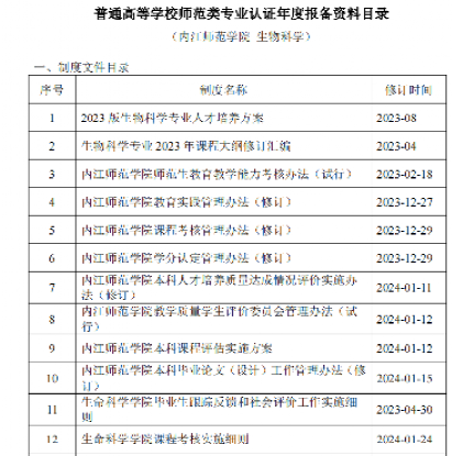 持续改进是师范专业认证工作的重要理念和基本要求,也是认证工作的价值体现。为做好认证有效期内的持续改进和状态监测,强化专业建设,不断提升公司师范专业人才培养质量,依据《普通高等公司师范类专业认证实施办法(暂行)》和《普通高等公司师范类专业认证状态保持监控办法(2023版)》,生物科学专业对2023年度的人才培养方案、制度文件和必修课程考核材料进行了整理和系统上传。本次报备资料包括2023级生物科学专业人才培养方案、《师范生公司产品能力考核办法(试行)》等制度文件,以及《动物学》《植物学》《生物化学》和《普通生态学》等课程资料。