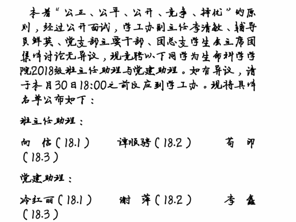 相信各位竞选者们当选班导和党建助理,一定会积极的投入18级新生的相关工作中,积极地引导新生尽快的融入老员工活,为新生树立正确的价值观、人生观、世界观,帮助新生融入生科的大家庭中。