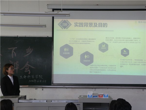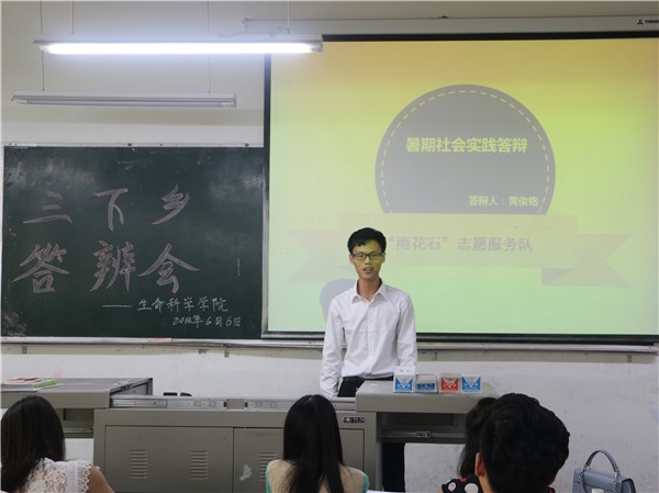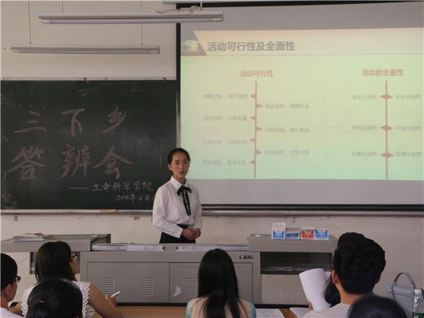 本次答辩会主要分为自由阐述和评委提问两个环节。首先,各队伍代表按照顺序依次上台围绕团队活动的主题、内容、目的、地点等方面进行汇报。然后,评委结合各队伍的实际情况提出相关的问题,团队代表详细地对这些问题进行了回答,之后评委也针对各团队存在的问题提出了宝贵的意见。今年共有5个团队参加了答辩会,分别是梦翼志愿服务队、雨花石团队、生命之星志愿服务队、“伴夏”志愿服务队、“嘉树”调研服务队和“鱼”悦志愿服务队。梦翼志愿服务队此次三下乡地点定在四川省凉山州冕宁县后山镇,该团队主要以禁毒防艾宣传、义务支教两种方式来进行此次活动。雨花石团队决定在达州市宣汉县普光镇以环保教育和社会服务两种方式来进行此次三下乡活动。第三个生命之星志愿服务队的三下乡活动选择在巴中市通江县诺水河镇进行,它主要从科技支农、学习红色文化两方面开展。“伴夏”志愿服务队选择在凉山州冕宁县锦屏镇二寺营村,从义务支教和社会调研两个角度来开展此次三下乡活动。“嘉树”调研服务队将活动地点定为南江县、通江县两个县城,并从园林资源采集、秦巴山区“精准扶贫”实况调研几个方面来进行此次活动。最后,“鱼”悦志愿服务队准备在泸州市古蔺县太平镇高笠村进行社会公益类活动。