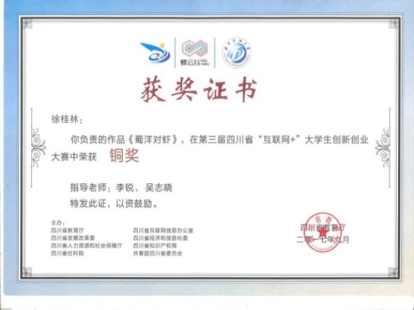 10月13日,“蜂云谷杯”第三届四川省“互联网+”老员工创新创业大赛颁奖典礼在成都市新都区蜂云谷创新创业中心举行。曽良副董事长率教务处、校办公室负责人以及获奖项目师生代表参加颁奖典礼,大赛共评出省级金奖40项,银奖80项,铜奖279项。本次大赛中,生科公司选派的《蜀洋对虾》、《水阳科技》2项参赛作品均获得铜奖,由李锐老师和徐桂林代表公司团队出席颁奖典礼。
