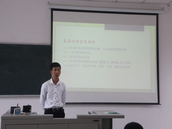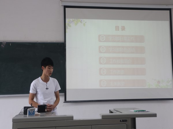 宣传部的总结工作由副部长曾梦同学来主持,总结内容主要是针对部门中拍照、撰写新闻以及公司新闻推送等日常工作进行介绍,她表明身为宣传部一员应该必备如何拍照片、如何做微信、如何写出一篇好的新闻这三项技能,并向各个班级提出班级新闻格式、字体格式、照片格式等要求。接下来是实践部副部长黄倩同学的总结,她对创业部在各项项目、大赛介绍和获奖情况、暑期实践活动进行汇总,并说:身为本部门的人应该必备材料收集的技能。然后是来自秘书处副部长吴田同学的汇报,他先介绍了部门成员和部门工作,然后指出了工作中的不足,表示会加以改进,并对未来做出了展望。接下来是学习部副部长张祥同学的总结,总结中介绍了学习部考勤、打表、场地申请等日常工作,提到了一些特色活动,并对自己部门人员所拥有的工作技能进行介绍。文娱部副部长杜祝林同学的总结包括工作成果,以及对各小组的工作进行简单的介绍,他们所拥有的工作技能是:与各班文娱委员的沟通与各个比赛的报名,最后提到了对艺术节工作的安排。生活部的副部长王涛涛同学介绍了部门成员,之后从寝室、教室、执勤、义务保洁、相关文化活动这五方面介绍了生活部的常规工作,并且对寝室免检表格填写和寝室复检的申请流程进行介绍。体育部的副部长谭顺骋同学介绍了早操晨练的相关事宜,还将上学期的工作进行了总结,对各类活动及运动会做了简单的介绍,并以照片的形式向大家展示了运动员的风采。