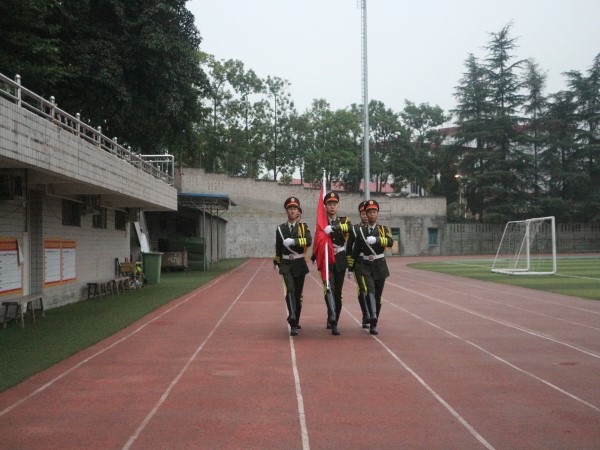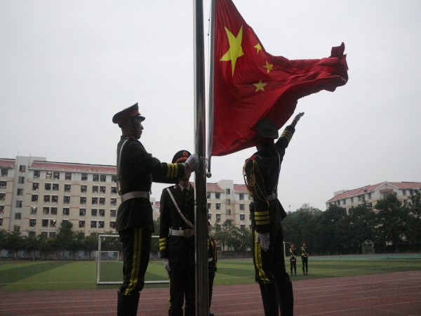 在全体师生的注目礼下,英姿飒爽的国旗护卫队队员们护送鲜艳的五星红旗进场。伴随着庄严的《中华人民共和国国歌》,五星红旗冉冉升起,迎风飘扬。在场的每一个人向国旗行注目礼,深怀对祖国无限的热爱和崇高的敬意。