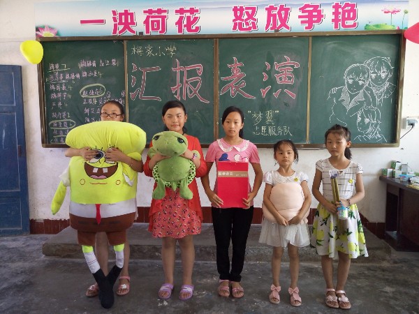 中午1点,志愿者们利用自己的午休时间来装扮教室,为下午的汇报表演做准备。下午3点,“爱心支教,圆梦飞翔”汇报表演如期而至。首先由我队队长进行开场致辞,随后由我队成员和员工组成的主持人开始主持,唱歌、跳舞、绘画成果展示、朗诵成果展示、集体演绎《感恩的心》手语等都有序地进行着。