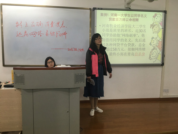 15级1班于2017年3月18日18:00点整,在第五教学楼北401开展了团组织生活会。首先主持人刘婷简要介绍了目前我们身边与不良网络借贷有关的事例并宣布活动开始。紧接着介绍网络诈骗的形式以及防骗方法,观看网络不良借贷视频,了解有关的“借贷陷阱”以及当代老员工“裸贷”现象造成的严重后果。并通过同学讨论、讲述身边具体案例,提醒同学陷阱处处有,天上没有白掉的馅饼。最后是游戏环节,网络诈骗知识有奖竞猜将不仅将班会气氛活跃起来,也将树立正确消费理念,远离网络金融陷阱的主题再次加深,使同学们记忆更加深刻,加强教育意义。