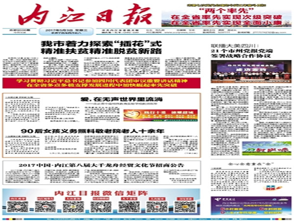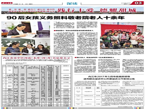 今年3月29日晚,公司2016年“十大学雷锋员工标兵”颁奖典礼在东区礼堂隆重举行。公司14级1班周平成功获选,并在班级晚会上分享了义务敬老路上遭受的重重阻碍,以及那些支撑自己一往无前的温暖和感动。公司和公司对周平同学的先进事迹进行广泛的宣传报道,近日,内江日报记者慕名前来对她进行专题采访,并在5月3日的内江日报“践行十爱 德耀甜城“专栏中“以90后女孩义务照料敬老院老人十余年”为题在第1、3版大篇幅地进行报道。
