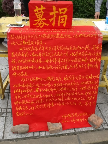 2017年4月17日至19日,太阳网集团tcy872215级2班与生命之星志愿服务队在游泳池及五食堂报刊亭为张莉萍同学举行了“传递爱心、情满内师”的募捐活动。