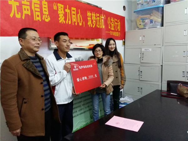 1月5日下午,四川无声信息技术有限公司副总经理贾忠惠等4人专程到校对公司16级4班贫困员工罗斌进行资助。公司党总支副书记黄作喜热情接待贾总一行,并与他们进行了座谈。学工办杨荣金老师、16级4班班主任陶敏及员工代表共同参与。