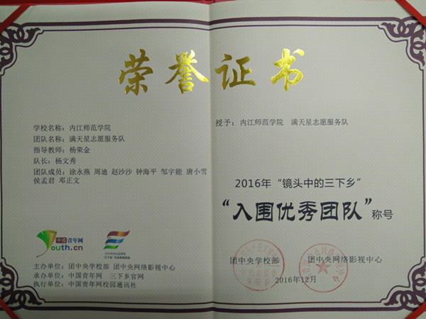 为展现2016年全国大中专员工志愿者暑期文化科技卫生“三下乡”社会实践活动的丰硕成果,展示员工践行“中国梦”的青春风采,挖掘一批有价值、有成效的暑期社会实践事迹,今年8-11月,团中央公司部和团中央网络影视中心联合举办了2016年“镜头中的三下乡”活动。经过网络评选推荐和最终的专家评审,公司太阳网集团tcy8722满天星志愿服务队最终获得“入围优秀团队”奖。这也是公司首次在该项活动中获奖。据统计,全国共有564所高校的3868支队伍参与评选,最终产生60支优秀团队和140支入围优秀团队。四川省共有200多支团队参评,其中来自4所高校的4支团队获得优秀团队奖,有8所高校的11支团队获“入围优秀团队”奖。