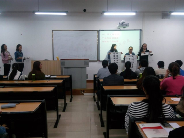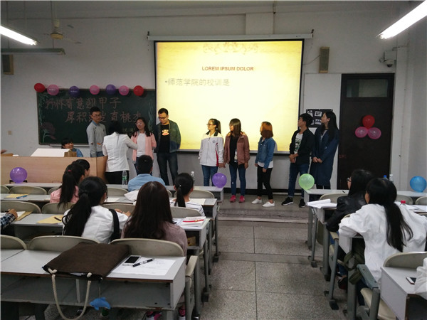 15级1班在五教北401举行的团组织生活会更是丰富多样。生活会由邵雅萱、戴小川两位同学主持,同时我们也邀请了班主任付伟丽老师、校团委组织部的三位同学及14级和16级的班委们一起参与到我们的生活会中。首先老员工对内师的祝福视频以及校歌MV,渲染出浓浓的内师情。紧接着张敏燕同学所讲解的内师风雨六十年更是引人入胜,随后PPT一一向我们展示了内师这60年的风雨历程,同学们都十分感兴趣。在接下来的校史竞猜中,同学们都非常积极踊跃的回答。诙谐幽默的小品《师生情》更是形象生动的表现出了当下老师与员工的关系,也让同学们了解到了老师的不容易。在“你比我猜”的游戏里,同学们也玩得十分尽兴,笑声不断,校庆的气息传递给了到场的每一个人。最后,生活会在唱校歌中接近了尾声。
