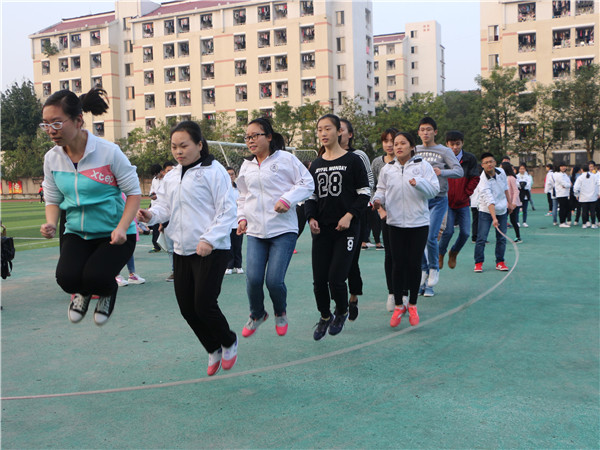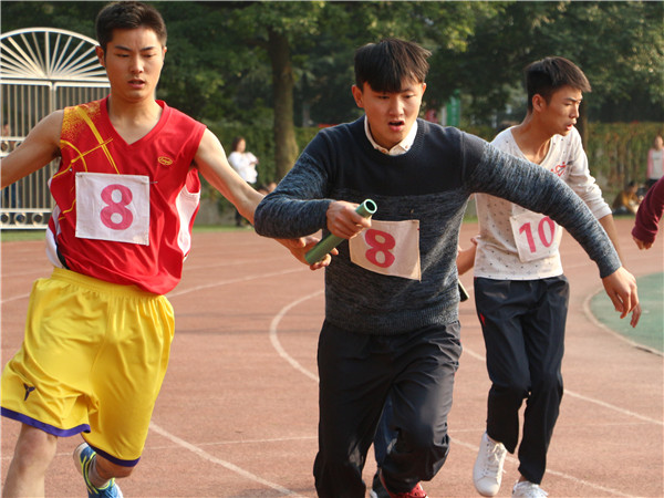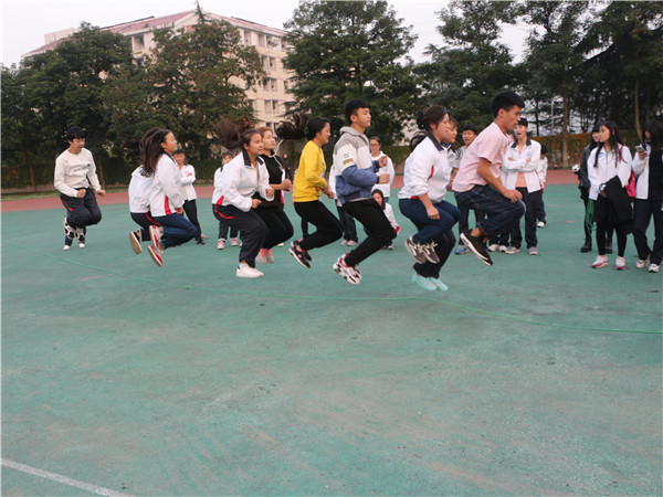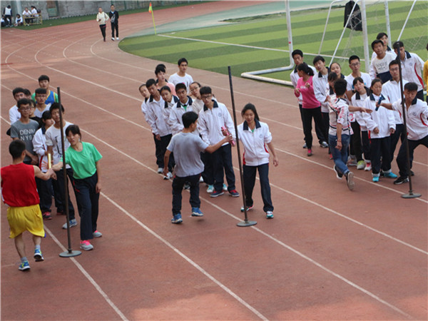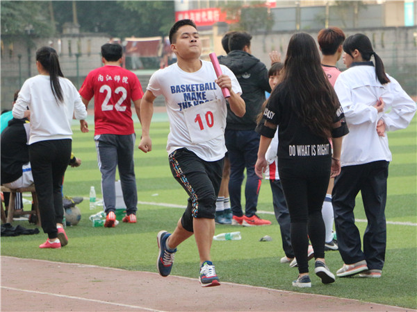 首先在上午举行的团体赛是勇往直前,每个队的参赛选手由二十名同学组成,男女同学各十名。二十个人全部排成一排,每个人的左手要抓住左边同学的腰,右手要抓住右边同学的肩膀,喊着口令,同时向前跑去,在这个过程中不能有一个人散开,否则成绩就作废。这个项目考验的是整个团队的配合和默契。在比赛之前,每个团队负责人都会组织好自己的团队,反复的练习。虽然在练习的过程中他们会有人和团体跑散开,或是摔倒,但他们却从未放弃过,反复的练习只期望在比赛中取得优异的成绩,比赛依次按14级各班,15级各班和16级各班分三轮进行,最终16级1班以9秒54的好成绩赢得本项比赛的冠军。下午举行了接力赛和跳绳比赛,接力赛分男女4×100米接力、4×400米男女混合接力和50米男女混合迎面接力。无论是哪场接力赛,队员们都在尽力奔跑,只希望在最短的时间把接力棒传递到同伴手中,一根小小的接力棒,连接的是团结和友爱;一根小小的接力棒,传递的是勇气和力量;一根小小的接力棒,演绎的是奋斗和拼搏。最终15.2同学分别以55秒10,1分零5秒和2分45秒45的好成绩同时赢得了男子4*100,女子4*100和男女混合50米迎面接力的冠军,14.1以5分07秒的好成绩取得了男女混女合4*400的第一名,这不仅是速度的挑战,更是团队间共同协作的力量。最后进行的是跳大绳项目,十名同学站在绳子中间,在大绳打在地上的瞬间整齐跳过,中途即使失败了,他们也依旧从容不迫的调整好状态,继续比赛,在大家的共同努力下,15.3的同学以90秒52个的好成绩赢得跳绳比赛的第一名。