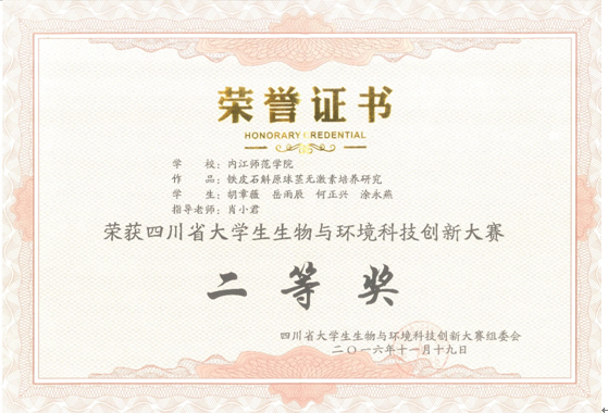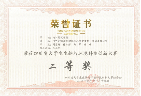 2016年11月19日,由四川省教育厅主办、四川农业大学承办的2016生物与环境科技创新大赛决赛在雅安举行。公司员工胡章薇、岳雨辰、何正兴、涂永燕提交的作品“铁皮石斛原球茎无激素培养研究”(指导教师肖小君)及周家辉、陈红萍、冯翠、唐瑞提交作品“BPA对稀有鮈鲫胚胎和卵黄囊期仔鱼发育毒性研究”(指导教师王永明)均获得二等奖,但菊花、舒柔提交作品“宽体沙鳅线粒体基因组特征和系统发育分析”(指导教师文正勇)获得三等奖。