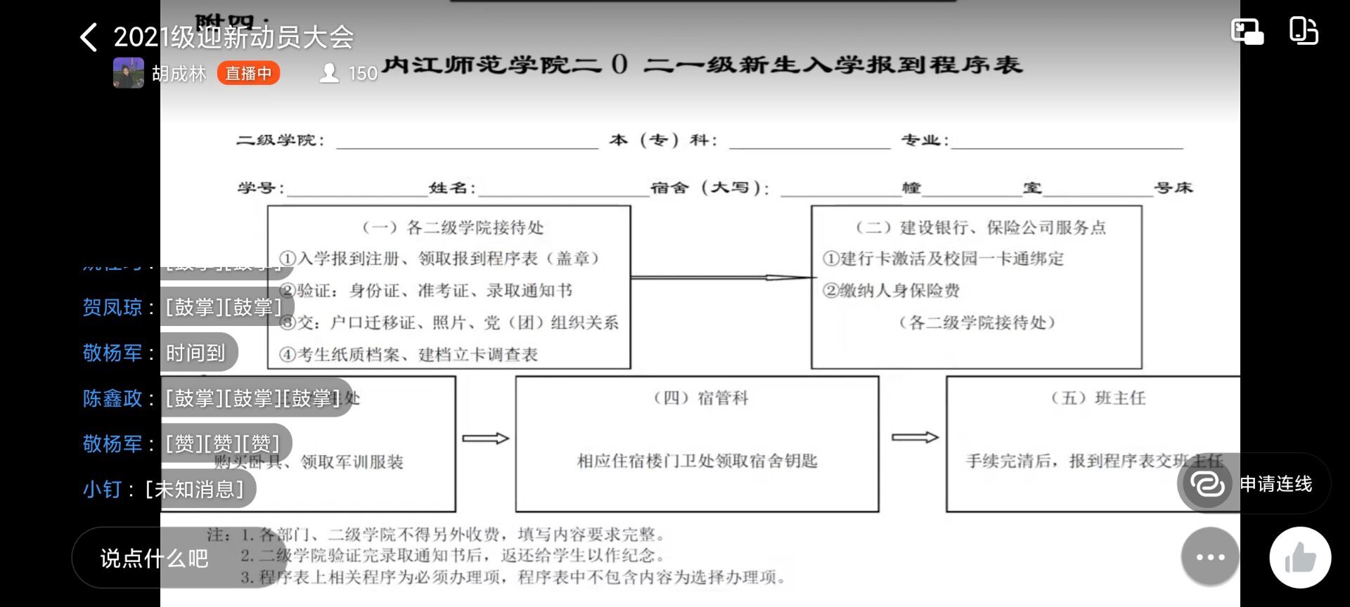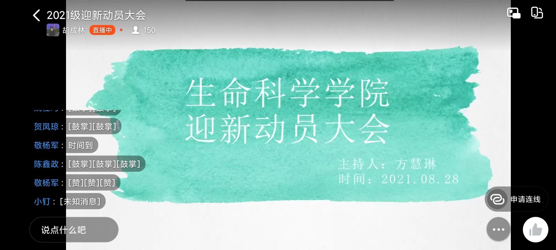 为协调安排迎新期间团总支员工会各部门以及各班志愿者的工作内容,保障迎新期间的工作秩序,为新生能够在入学时更快更好地融入校园生活,公司于2021年8月28日晚上8:00开展了2021年迎新动员线上大会。参加此次会议的人员有辅导员杨雪娜老师,团总支员工会各部门成员以及各班迎新志愿者。