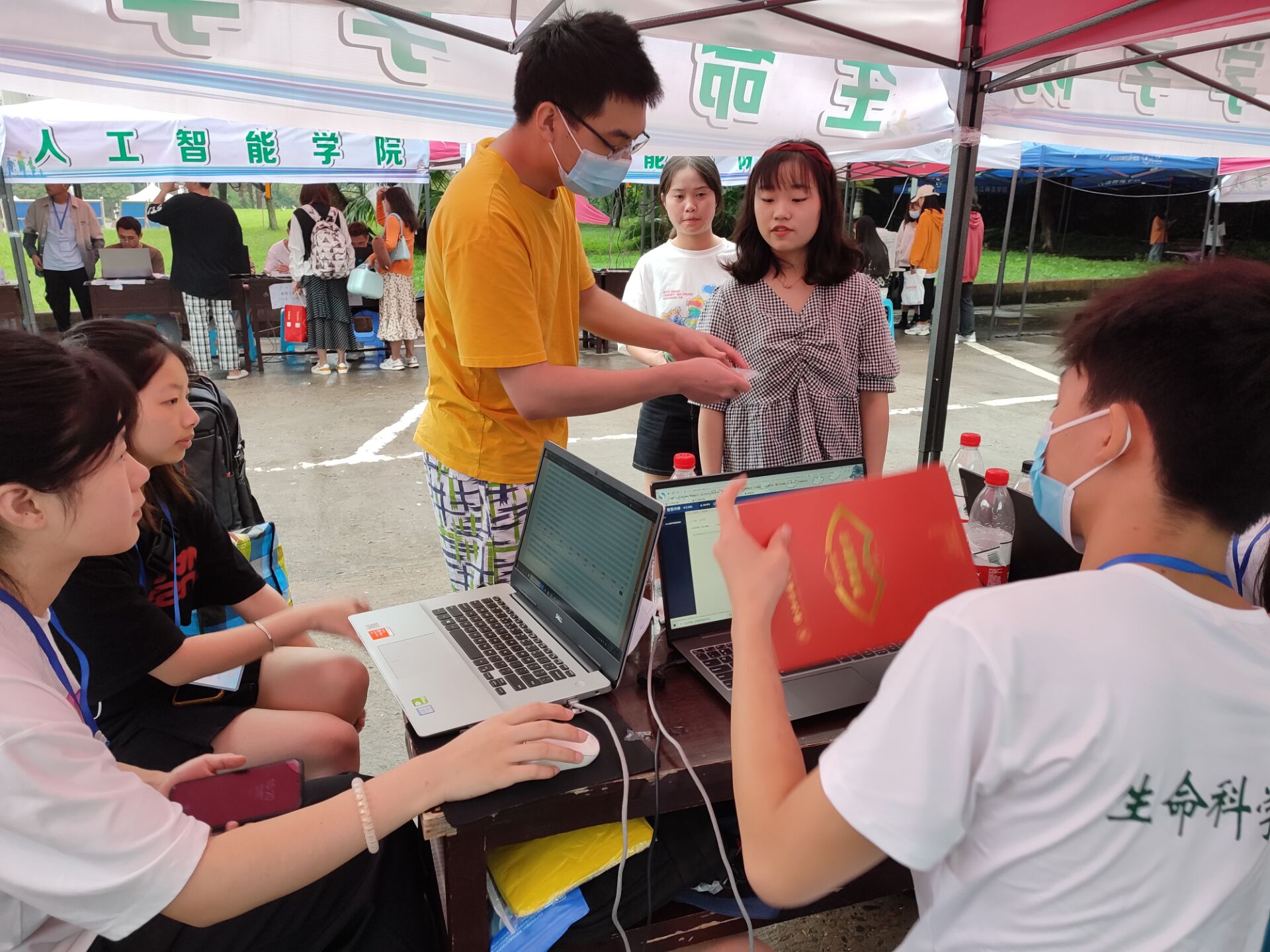 9月5日早上7点,学长学姐们就已经准备好当天所需物品,8点前所有人员已经到位,随时准备迎接新生。尽管5日报到时下着雨,但工作人员和志愿者依旧没有懈怠。在火车站、汽车站设立的接待点,每一趟车一到站,新生和家长一下车,众多的迎新志愿者马上帮忙接下新生和家长手中沉重的行李,接车引导员在校车到达的第一时间引导新生到生科公司报到处报到。志愿者对接后带领新生到登记处录入信息,然后核对身份,交完学费与保险费之后就带领新生去领取军训服装和棉被以及校服。公司也开设了绿色通道,为办理了贷款的同学能更方便快捷的完成报名。公司领导和各教学系主要领导以及新生辅导员也亲临服务台,协调新生接待工作,并与新生亲切交谈,询问新生家庭情况,勉励新生。在宿舍方面,新生在公司宣传人员的带领和帮助下,顺利入住。运送行李的志愿者作为整个迎新工作最劳累的成员也毫无怨言。入住后,志愿者便带领新生去将建行卡激活方便以后的缴费与公司饭卡充值,途中给新生介绍了公司的基本情况,让新生们能够更快的熟悉校园。