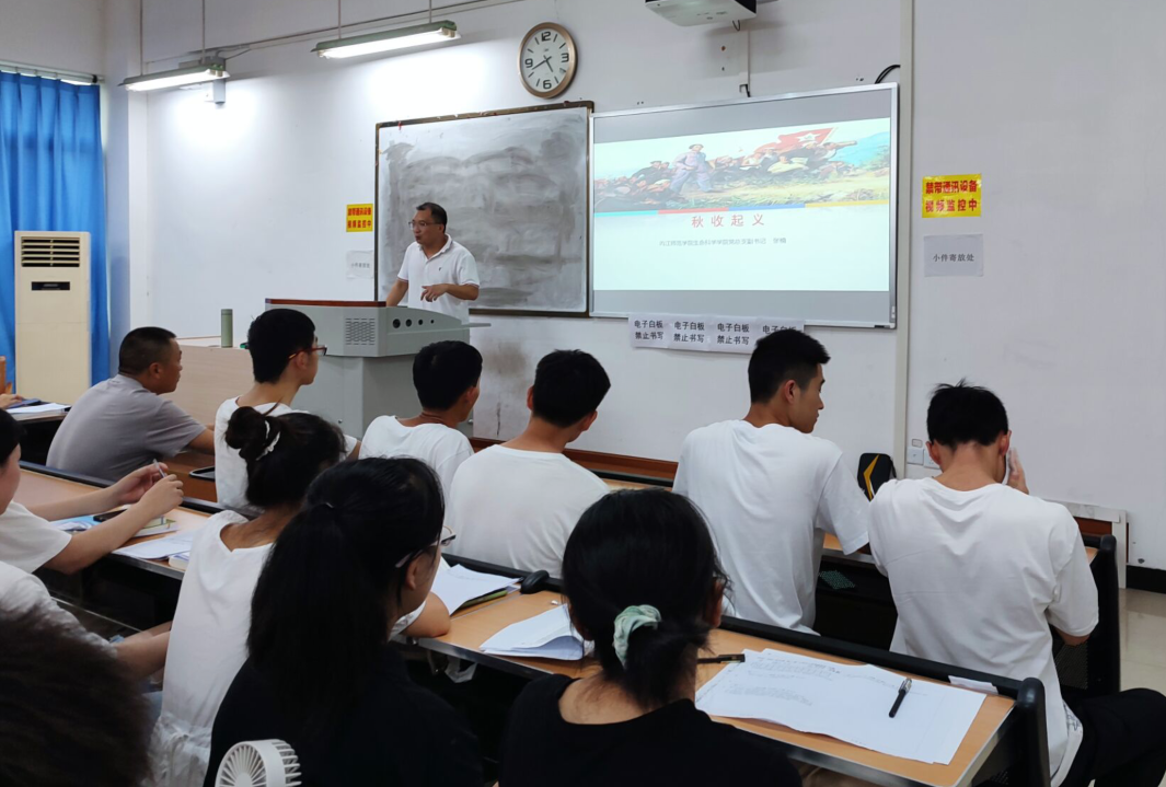 党课的主题为秋收起义。张楠老师首先讲述秋收起义的背景和起义的过程,其次是介绍本堂的重点内容——秋收起义的意义。第一,人民军队历史上第一面军旗的诞生;第二,第一次确立支部建在连上的制度;第三,入党誓词中第一次加入了“永不叛党”四个字。再次,介绍了收起义产生的影响。最后,张楠教授希望同学们能够铭记历史,以党的十九精神为指导,积极向党靠拢。