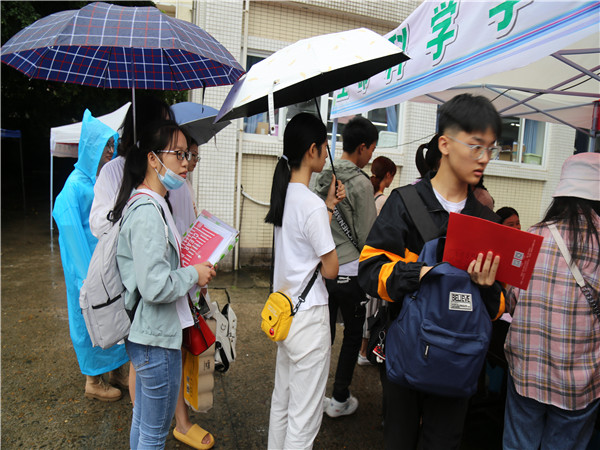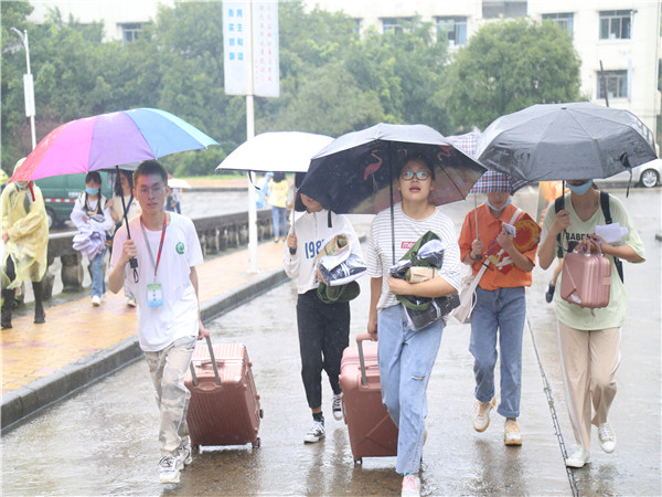 2020年9月13日,新生接待工作已经到了第二天。奈何天公不作美,虽然少了夏日的暑气蒸腾,但却多了金秋的绵绵细雨。秋雨淋湿了志愿者们的衣衫,却淋不湿志愿者们积极迎接新生的热情。为了保证迎新工作顺利进行,每一位志愿者都始终坚守在迎新工作的一线,及时将新生带往报到点。