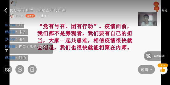 “八方驰援战疫情,众志成城克时难”随着抗疫工作的开展,我国的防控疫情取得了有效成果。为深入学习疫情防控知识,响应国家防控工作要求,坚定信心众志成城共同抗疫,公司16级至19级特开展了以“共战‘疫’同担当,团员青年应自强"为主题的团组织生活会。为了响应疫情期间“居家防护”的号召,本次团组织生活会特采取线上模式开展。